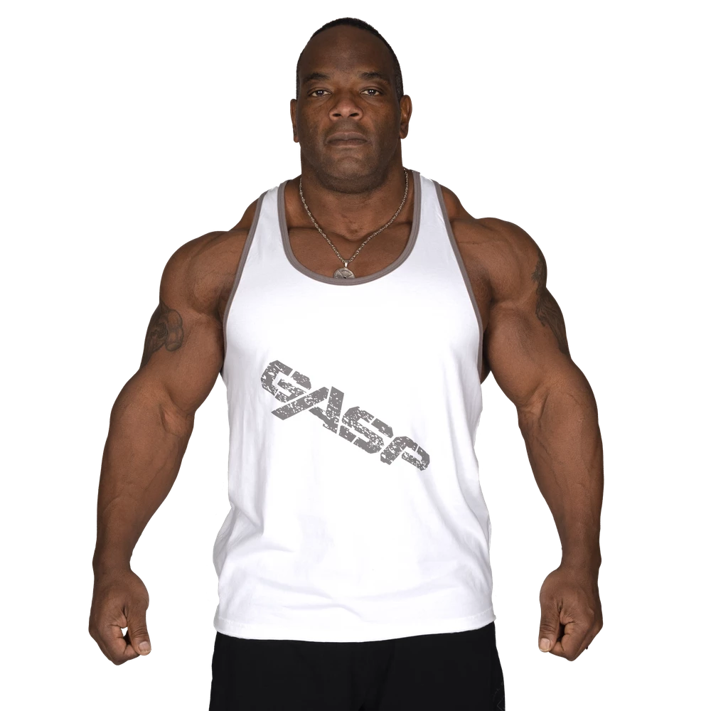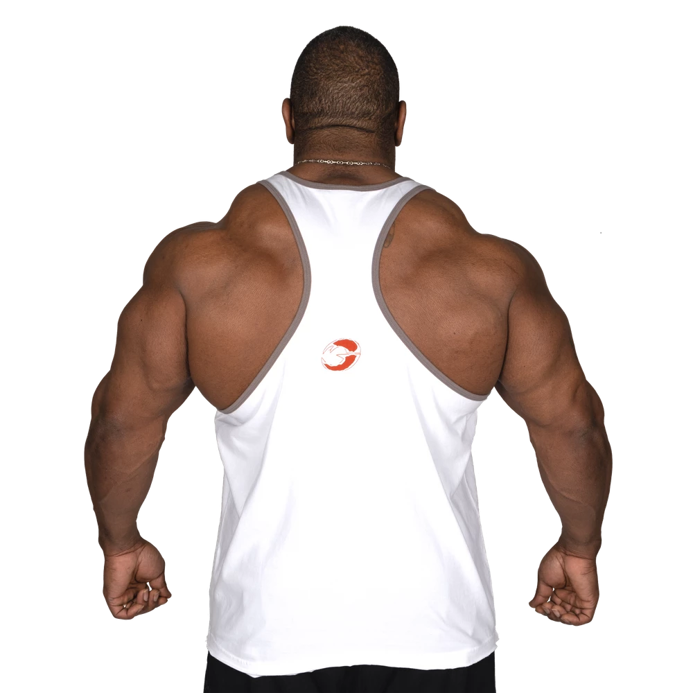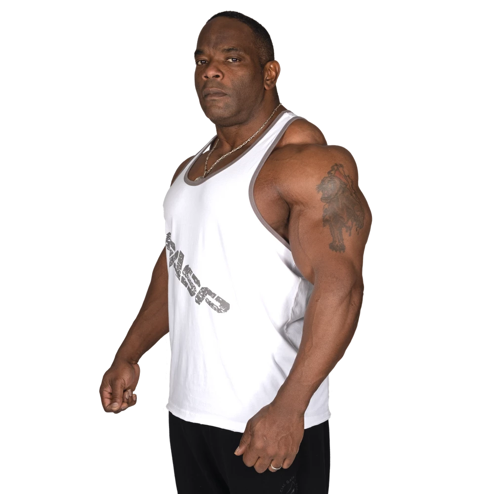 The Vintage T-back is made out of a soft and comfortable cotton jersey fabric. It has a massive print across the front, a vertical print along the sides and two smaller logos at the back just below the traps area. It has a classic T-back cut and a loose fit.