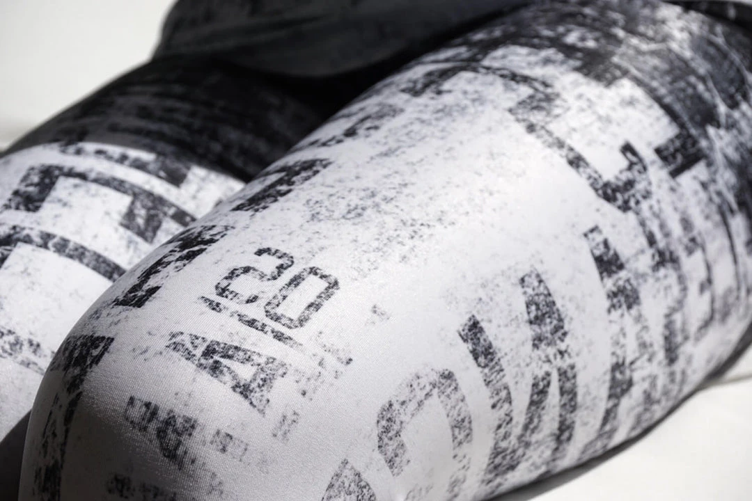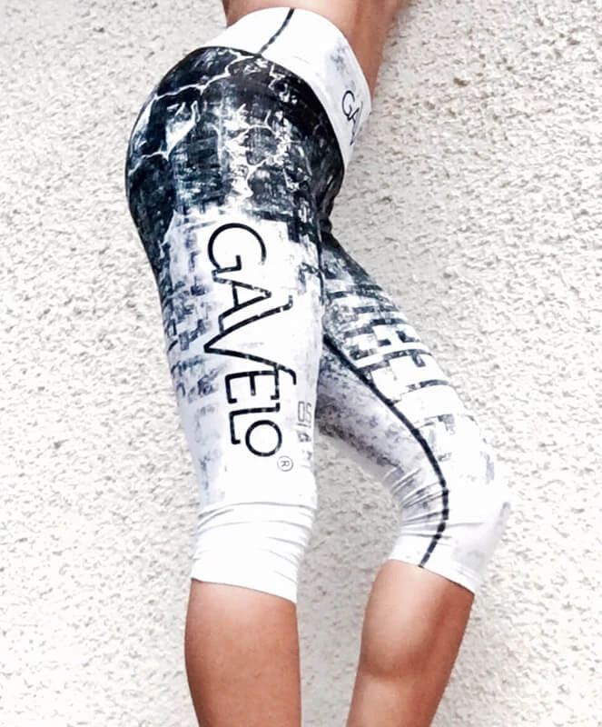 The Gavelo logo in black is placed on the side of the right thigh on a base of what could be either concrete cracks or a tattered newspaper.