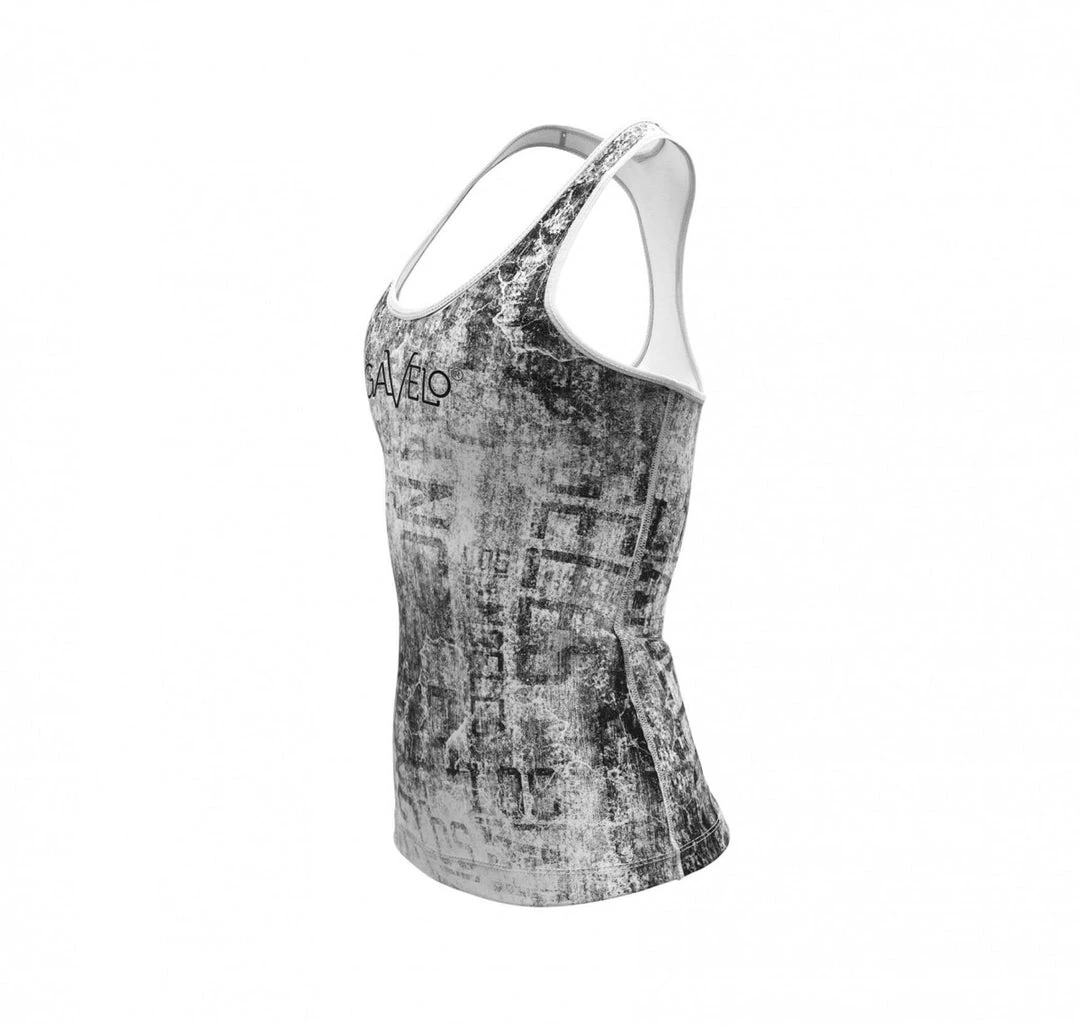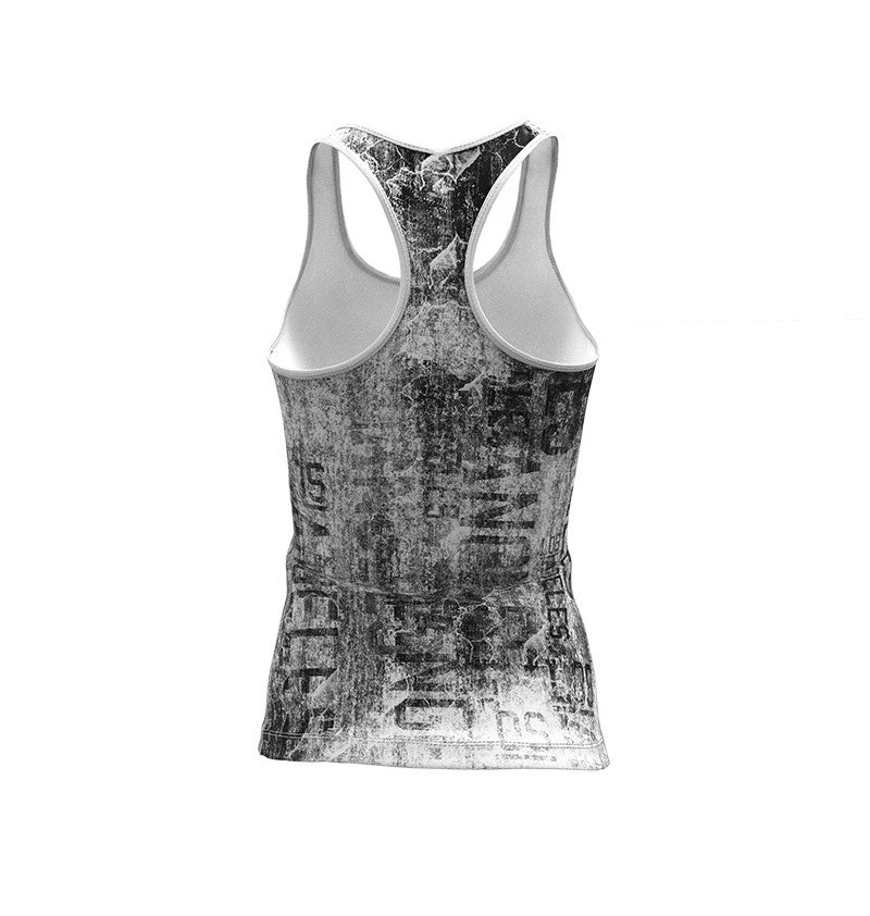 A design truly inspired by the tropical concrete jungle that is Los Angeles. A base of what could be either concrete cracks or a tattered newspaper. You will find the name of the model (Los Angeles) on several places in the pattern, which goes in the colors of black, grey and white. The racerback design allows full range of motion. The Gavelo logo in black on the chest and between shoulder blades. White stitching details. Why not be extra neat- and wear it together with the Los Angeles tights!
