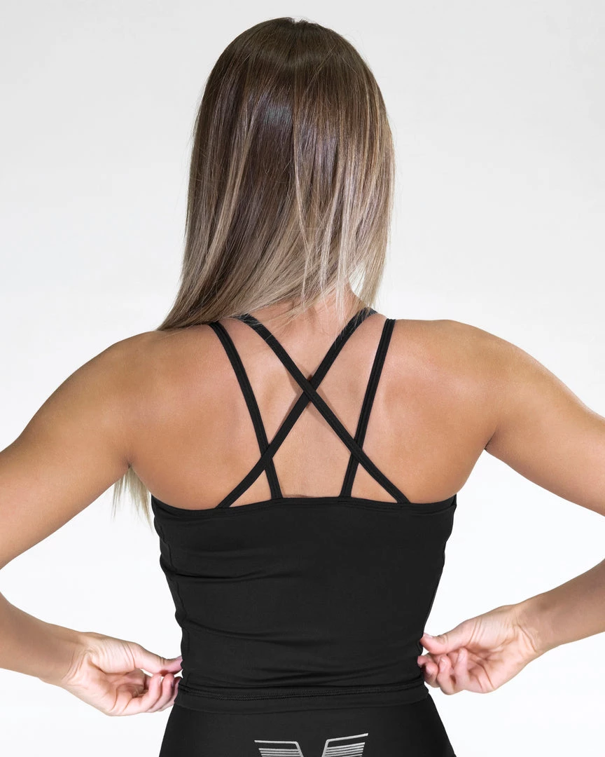 Black tank top with shoulder straps that form a decorative pattern in the back. The fabric is stretchy and very exclusive to help to keep you dry. Slightly shorter model to fit perfectly with POP leggings with high waist!