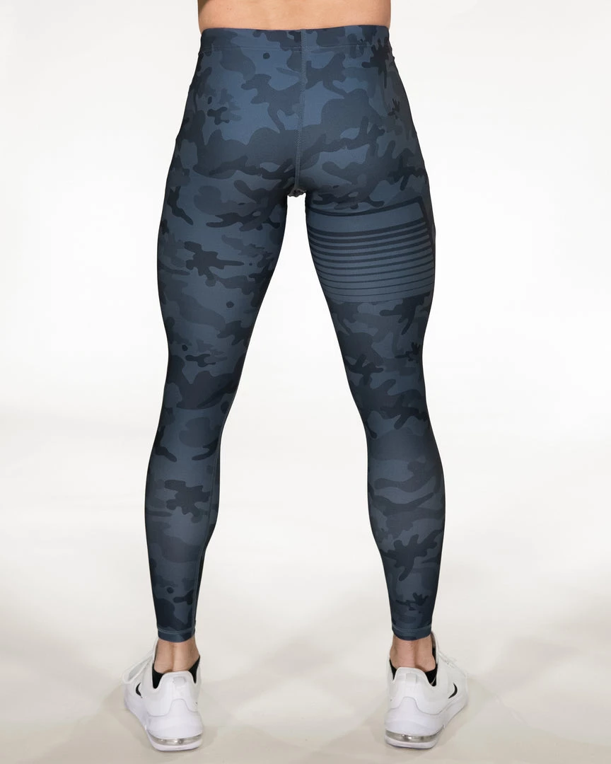 Blue camo leggings with perfect fit. Made of high quality fabric that holds the shape. Mens leggings with good compression and 360 degrees stretch for the best effect. Fast drying fabric, that keeps you dry. Works great both for running and the gym.