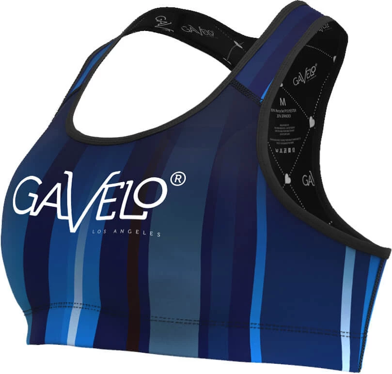 Medium support. The racerback design allows full range of motion. This Sports Bra is made with a 73% rPET and a 27% Lycra blend. The rPET is polyester made out of recycled PET-bottles. The Lycra is in the blend to give the fabric its comfortable stretch. UPF 50+ sun protection. A nice and decorative lining, that makes for good breathability. A variation of blue stripes goes from the top to the bottom. Gavelo logo in white on the chest.
