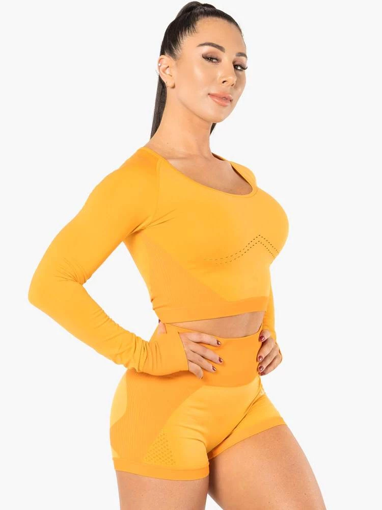 Perfect for workouts and warm ups, the Electra Seamless Long Sleeve Crop gives your training the spark it deserves. Our signature seamless fabric offers unparalleled comfort and flexibility, with an eye-catching low neckline to flatter your upper body. This lightweight long sleeve top radiates sporty sex appeal, but features seamless mesh detailing to keep things from ever becoming too hot. Pair with the Electra Seamless Shorts.